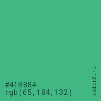 Цвет #41B884 в цветовой модели RGB обозначается тремя октетами (65, 184, 132) в десятичном формате и #41B884 в шестнадцатиричном (hex) формате, которые являются интенсивностью красного 65 (hex 41), интенсивность зелёного 184 (hex B8) и интенсивность синего 132 (hex 84).