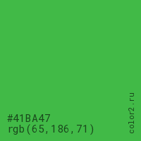 Цвет #41BA47 в цветовой модели RGB обозначается тремя октетами (65, 186, 71) в десятичном формате и #41BA47 в шестнадцатиричном (hex) формате, которые являются интенсивностью красного 65 (hex 41), интенсивность зелёного 186 (hex BA) и интенсивность синего 71 (hex 47).