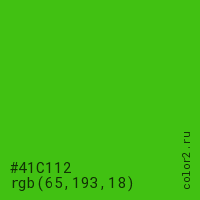 Цвет #41C112 в цветовой модели RGB обозначается тремя октетами (65, 193, 18) в десятичном формате и #41C112 в шестнадцатиричном (hex) формате, которые являются интенсивностью красного 65 (hex 41), интенсивность зелёного 193 (hex C1) и интенсивность синего 18 (hex 12).