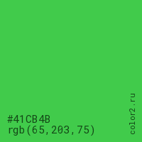 Цвет #41CB4B в цветовой модели RGB обозначается тремя октетами (65, 203, 75) в десятичном формате и #41CB4B в шестнадцатиричном (hex) формате, которые являются интенсивностью красного 65 (hex 41), интенсивность зелёного 203 (hex CB) и интенсивность синего 75 (hex 4B).