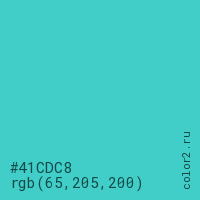 Цвет #41CDC8 в цветовой модели RGB обозначается тремя октетами (65, 205, 200) в десятичном формате и #41CDC8 в шестнадцатиричном (hex) формате, которые являются интенсивностью красного 65 (hex 41), интенсивность зелёного 205 (hex CD) и интенсивность синего 200 (hex C8).