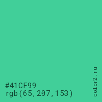 Цвет #41CF99 в цветовой модели RGB обозначается тремя октетами (65, 207, 153) в десятичном формате и #41CF99 в шестнадцатиричном (hex) формате, которые являются интенсивностью красного 65 (hex 41), интенсивность зелёного 207 (hex CF) и интенсивность синего 153 (hex 99).