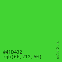 Цвет #41D432 в цветовой модели RGB обозначается тремя октетами (65, 212, 50) в десятичном формате и #41D432 в шестнадцатиричном (hex) формате, которые являются интенсивностью красного 65 (hex 41), интенсивность зелёного 212 (hex D4) и интенсивность синего 50 (hex 32).