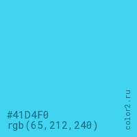 Цвет #41D4F0 в цветовой модели RGB обозначается тремя октетами (65, 212, 240) в десятичном формате и #41D4F0 в шестнадцатиричном (hex) формате, которые являются интенсивностью красного 65 (hex 41), интенсивность зелёного 212 (hex D4) и интенсивность синего 240 (hex F0).