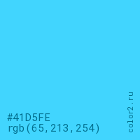 Цвет #41D5FE в цветовой модели RGB обозначается тремя октетами (65, 213, 254) в десятичном формате и #41D5FE в шестнадцатиричном (hex) формате, которые являются интенсивностью красного 65 (hex 41), интенсивность зелёного 213 (hex D5) и интенсивность синего 254 (hex FE).