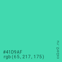 Цвет #41D9AF в цветовой модели RGB обозначается тремя октетами (65, 217, 175) в десятичном формате и #41D9AF в шестнадцатиричном (hex) формате, которые являются интенсивностью красного 65 (hex 41), интенсивность зелёного 217 (hex D9) и интенсивность синего 175 (hex AF).