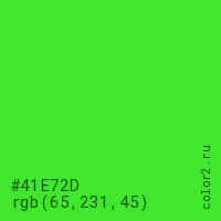 Цвет #41E72D в цветовой модели RGB обозначается тремя октетами (65, 231, 45) в десятичном формате и #41E72D в шестнадцатиричном (hex) формате, которые являются интенсивностью красного 65 (hex 41), интенсивность зелёного 231 (hex E7) и интенсивность синего 45 (hex 2D).