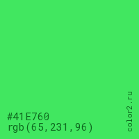 Цвет #41E760 в цветовой модели RGB обозначается тремя октетами (65, 231, 96) в десятичном формате и #41E760 в шестнадцатиричном (hex) формате, которые являются интенсивностью красного 65 (hex 41), интенсивность зелёного 231 (hex E7) и интенсивность синего 96 (hex 60).