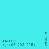 Цвет #41EEEB в цветовой модели RGB обозначается тремя октетами (65, 238, 235) в десятичном формате и #41EEEB в шестнадцатиричном (hex) формате, которые являются интенсивностью красного 65 (hex 41), интенсивность зелёного 238 (hex EE) и интенсивность синего 235 (hex EB).