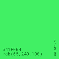 Цвет #41F064 в цветовой модели RGB обозначается тремя октетами (65, 240, 100) в десятичном формате и #41F064 в шестнадцатиричном (hex) формате, которые являются интенсивностью красного 65 (hex 41), интенсивность зелёного 240 (hex F0) и интенсивность синего 100 (hex 64).