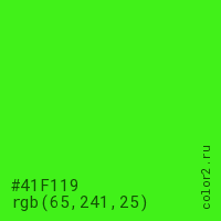 Цвет #41F119 в цветовой модели RGB обозначается тремя октетами (65, 241, 25) в десятичном формате и #41F119 в шестнадцатиричном (hex) формате, которые являются интенсивностью красного 65 (hex 41), интенсивность зелёного 241 (hex F1) и интенсивность синего 25 (hex 19).