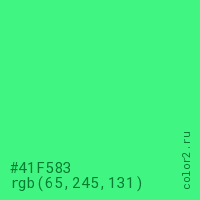 Цвет #41F583 в цветовой модели RGB обозначается тремя октетами (65, 245, 131) в десятичном формате и #41F583 в шестнадцатиричном (hex) формате, которые являются интенсивностью красного 65 (hex 41), интенсивность зелёного 245 (hex F5) и интенсивность синего 131 (hex 83).