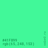 Цвет #41F899 в цветовой модели RGB обозначается тремя октетами (65, 248, 153) в десятичном формате и #41F899 в шестнадцатиричном (hex) формате, которые являются интенсивностью красного 65 (hex 41), интенсивность зелёного 248 (hex F8) и интенсивность синего 153 (hex 99).