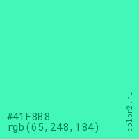 Цвет #41F8B8 в цветовой модели RGB обозначается тремя октетами (65, 248, 184) в десятичном формате и #41F8B8 в шестнадцатиричном (hex) формате, которые являются интенсивностью красного 65 (hex 41), интенсивность зелёного 248 (hex F8) и интенсивность синего 184 (hex B8).