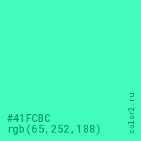 Цвет #41FCBC в цветовой модели RGB обозначается тремя октетами (65, 252, 188) в десятичном формате и #41FCBC в шестнадцатиричном (hex) формате, которые являются интенсивностью красного 65 (hex 41), интенсивность зелёного 252 (hex FC) и интенсивность синего 188 (hex BC).