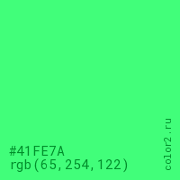 Цвет #41FE7A в цветовой модели RGB обозначается тремя октетами (65, 254, 122) в десятичном формате и #41FE7A в шестнадцатиричном (hex) формате, которые являются интенсивностью красного 65 (hex 41), интенсивность зелёного 254 (hex FE) и интенсивность синего 122 (hex 7A).