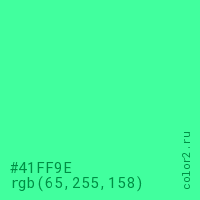 Цвет #41FF9E в цветовой модели RGB обозначается тремя октетами (65, 255, 158) в десятичном формате и #41FF9E в шестнадцатиричном (hex) формате, которые являются интенсивностью красного 65 (hex 41), интенсивность зелёного 255 (hex FF) и интенсивность синего 158 (hex 9E).