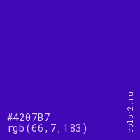 Цвет #4207B7 в цветовой модели RGB обозначается тремя октетами (66, 7, 183) в десятичном формате и #4207B7 в шестнадцатиричном (hex) формате, которые являются интенсивностью красного 66 (hex 42), интенсивность зелёного 7 (hex 07) и интенсивность синего 183 (hex B7).
