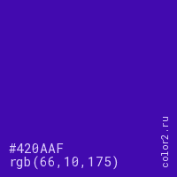 Цвет #420AAF в цветовой модели RGB обозначается тремя октетами (66, 10, 175) в десятичном формате и #420AAF в шестнадцатиричном (hex) формате, которые являются интенсивностью красного 66 (hex 42), интенсивность зелёного 10 (hex 0A) и интенсивность синего 175 (hex AF).
