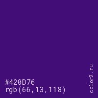 Цвет #420D76 в цветовой модели RGB обозначается тремя октетами (66, 13, 118) в десятичном формате и #420D76 в шестнадцатиричном (hex) формате, которые являются интенсивностью красного 66 (hex 42), интенсивность зелёного 13 (hex 0D) и интенсивность синего 118 (hex 76).