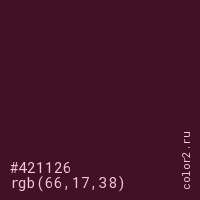 Цвет #421126 в цветовой модели RGB обозначается тремя октетами (66, 17, 38) в десятичном формате и #421126 в шестнадцатиричном (hex) формате, которые являются интенсивностью красного 66 (hex 42), интенсивность зелёного 17 (hex 11) и интенсивность синего 38 (hex 26).