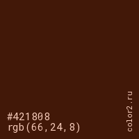 Цвет #421808 в цветовой модели RGB обозначается тремя октетами (66, 24, 8) в десятичном формате и #421808 в шестнадцатиричном (hex) формате, которые являются интенсивностью красного 66 (hex 42), интенсивность зелёного 24 (hex 18) и интенсивность синего 8 (hex 08).
