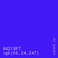 Цвет #4218F7 в цветовой модели RGB обозначается тремя октетами (66, 24, 247) в десятичном формате и #4218F7 в шестнадцатиричном (hex) формате, которые являются интенсивностью красного 66 (hex 42), интенсивность зелёного 24 (hex 18) и интенсивность синего 247 (hex F7).