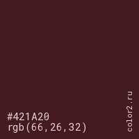 Цвет #421A20 в цветовой модели RGB обозначается тремя октетами (66, 26, 32) в десятичном формате и #421A20 в шестнадцатиричном (hex) формате, которые являются интенсивностью красного 66 (hex 42), интенсивность зелёного 26 (hex 1A) и интенсивность синего 32 (hex 20).