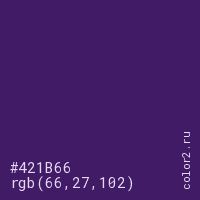 Цвет #421B66 в цветовой модели RGB обозначается тремя октетами (66, 27, 102) в десятичном формате и #421B66 в шестнадцатиричном (hex) формате, которые являются интенсивностью красного 66 (hex 42), интенсивность зелёного 27 (hex 1B) и интенсивность синего 102 (hex 66).