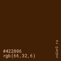 Цвет #422006 в цветовой модели RGB обозначается тремя октетами (66, 32, 6) в десятичном формате и #422006 в шестнадцатиричном (hex) формате, которые являются интенсивностью красного 66 (hex 42), интенсивность зелёного 32 (hex 20) и интенсивность синего 6 (hex 06).