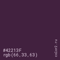 Цвет #42213F в цветовой модели RGB обозначается тремя октетами (66, 33, 63) в десятичном формате и #42213F в шестнадцатиричном (hex) формате, которые являются интенсивностью красного 66 (hex 42), интенсивность зелёного 33 (hex 21) и интенсивность синего 63 (hex 3F).
