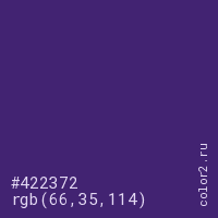 Цвет #422372 в цветовой модели RGB обозначается тремя октетами (66, 35, 114) в десятичном формате и #422372 в шестнадцатиричном (hex) формате, которые являются интенсивностью красного 66 (hex 42), интенсивность зелёного 35 (hex 23) и интенсивность синего 114 (hex 72).