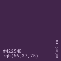 Цвет #42254B в цветовой модели RGB обозначается тремя октетами (66, 37, 75) в десятичном формате и #42254B в шестнадцатиричном (hex) формате, которые являются интенсивностью красного 66 (hex 42), интенсивность зелёного 37 (hex 25) и интенсивность синего 75 (hex 4B).