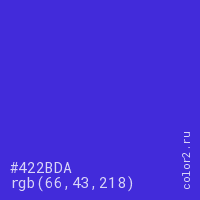 Цвет #422BDA в цветовой модели RGB обозначается тремя октетами (66, 43, 218) в десятичном формате и #422BDA в шестнадцатиричном (hex) формате, которые являются интенсивностью красного 66 (hex 42), интенсивность зелёного 43 (hex 2B) и интенсивность синего 218 (hex DA).