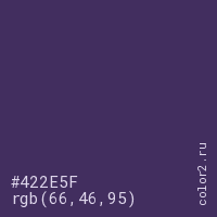 Цвет #422E5F в цветовой модели RGB обозначается тремя октетами (66, 46, 95) в десятичном формате и #422E5F в шестнадцатиричном (hex) формате, которые являются интенсивностью красного 66 (hex 42), интенсивность зелёного 46 (hex 2E) и интенсивность синего 95 (hex 5F).