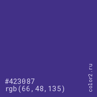 Цвет #423087 в цветовой модели RGB обозначается тремя октетами (66, 48, 135) в десятичном формате и #423087 в шестнадцатиричном (hex) формате, которые являются интенсивностью красного 66 (hex 42), интенсивность зелёного 48 (hex 30) и интенсивность синего 135 (hex 87).