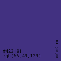 Цвет #423181 в цветовой модели RGB обозначается тремя октетами (66, 49, 129) в десятичном формате и #423181 в шестнадцатиричном (hex) формате, которые являются интенсивностью красного 66 (hex 42), интенсивность зелёного 49 (hex 31) и интенсивность синего 129 (hex 81).
