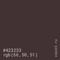 Цвет #423233 в цветовой модели RGB обозначается тремя октетами (66, 50, 51) в десятичном формате и #423233 в шестнадцатиричном (hex) формате, которые являются интенсивностью красного 66 (hex 42), интенсивность зелёного 50 (hex 32) и интенсивность синего 51 (hex 33).