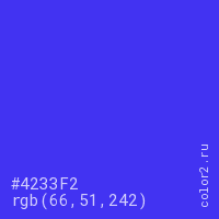 Цвет #4233F2 в цветовой модели RGB обозначается тремя октетами (66, 51, 242) в десятичном формате и #4233F2 в шестнадцатиричном (hex) формате, которые являются интенсивностью красного 66 (hex 42), интенсивность зелёного 51 (hex 33) и интенсивность синего 242 (hex F2).