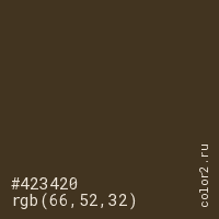 Цвет #423420 в цветовой модели RGB обозначается тремя октетами (66, 52, 32) в десятичном формате и #423420 в шестнадцатиричном (hex) формате, которые являются интенсивностью красного 66 (hex 42), интенсивность зелёного 52 (hex 34) и интенсивность синего 32 (hex 20).