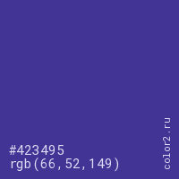 Цвет #423495 в цветовой модели RGB обозначается тремя октетами (66, 52, 149) в десятичном формате и #423495 в шестнадцатиричном (hex) формате, которые являются интенсивностью красного 66 (hex 42), интенсивность зелёного 52 (hex 34) и интенсивность синего 149 (hex 95).