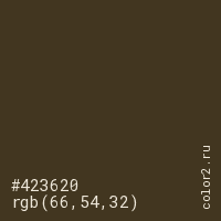 Цвет #423620 в цветовой модели RGB обозначается тремя октетами (66, 54, 32) в десятичном формате и #423620 в шестнадцатиричном (hex) формате, которые являются интенсивностью красного 66 (hex 42), интенсивность зелёного 54 (hex 36) и интенсивность синего 32 (hex 20).