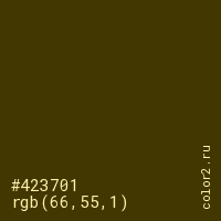 Цвет #423701 в цветовой модели RGB обозначается тремя октетами (66, 55, 1) в десятичном формате и #423701 в шестнадцатиричном (hex) формате, которые являются интенсивностью красного 66 (hex 42), интенсивность зелёного 55 (hex 37) и интенсивность синего 1 (hex 01).