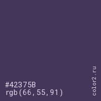 Цвет #42375B в цветовой модели RGB обозначается тремя октетами (66, 55, 91) в десятичном формате и #42375B в шестнадцатиричном (hex) формате, которые являются интенсивностью красного 66 (hex 42), интенсивность зелёного 55 (hex 37) и интенсивность синего 91 (hex 5B).