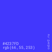 Цвет #4237FD в цветовой модели RGB обозначается тремя октетами (66, 55, 253) в десятичном формате и #4237FD в шестнадцатиричном (hex) формате, которые являются интенсивностью красного 66 (hex 42), интенсивность зелёного 55 (hex 37) и интенсивность синего 253 (hex FD).