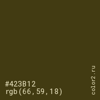 Цвет #423B12 в цветовой модели RGB обозначается тремя октетами (66, 59, 18) в десятичном формате и #423B12 в шестнадцатиричном (hex) формате, которые являются интенсивностью красного 66 (hex 42), интенсивность зелёного 59 (hex 3B) и интенсивность синего 18 (hex 12).
