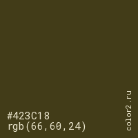Цвет #423C18 в цветовой модели RGB обозначается тремя октетами (66, 60, 24) в десятичном формате и #423C18 в шестнадцатиричном (hex) формате, которые являются интенсивностью красного 66 (hex 42), интенсивность зелёного 60 (hex 3C) и интенсивность синего 24 (hex 18).