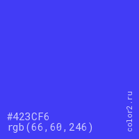 Цвет #423CF6 в цветовой модели RGB обозначается тремя октетами (66, 60, 246) в десятичном формате и #423CF6 в шестнадцатиричном (hex) формате, которые являются интенсивностью красного 66 (hex 42), интенсивность зелёного 60 (hex 3C) и интенсивность синего 246 (hex F6).