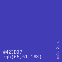 Цвет #423DB7 в цветовой модели RGB обозначается тремя октетами (66, 61, 183) в десятичном формате и #423DB7 в шестнадцатиричном (hex) формате, которые являются интенсивностью красного 66 (hex 42), интенсивность зелёного 61 (hex 3D) и интенсивность синего 183 (hex B7).