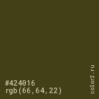 Цвет #424016 в цветовой модели RGB обозначается тремя октетами (66, 64, 22) в десятичном формате и #424016 в шестнадцатиричном (hex) формате, которые являются интенсивностью красного 66 (hex 42), интенсивность зелёного 64 (hex 40) и интенсивность синего 22 (hex 16).